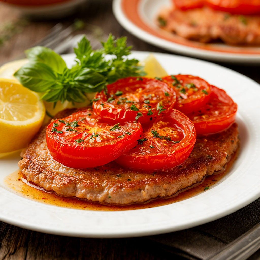 Изысканное блюдо для вашего стола:Эскалопы с жареными помидорами.