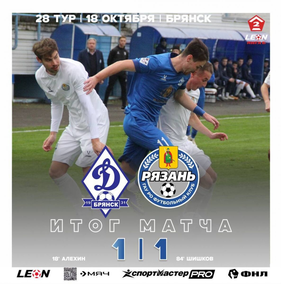 Завершился матч Второй лиги дивизиона «Б» между футбольными клубами «Рязань» и «Динамо» из Брянска, который завершился со счетом 1:1. На 18-й минуте встречи Алехин открыл счет, поразив ворота рязанской команды. Во втором тайме обе команды произвели ряд замен, и на 84-й минуте Шишкову удалось сравнять счет. По текущему положению в турнирной таблице брянское «Динамо» занимает вторую строчку, тогда как «Рязань» располагается на шестой позиции. Следующую игру рязанская команда проведет 25 октября в 14:00 против команды «Квант». 0+