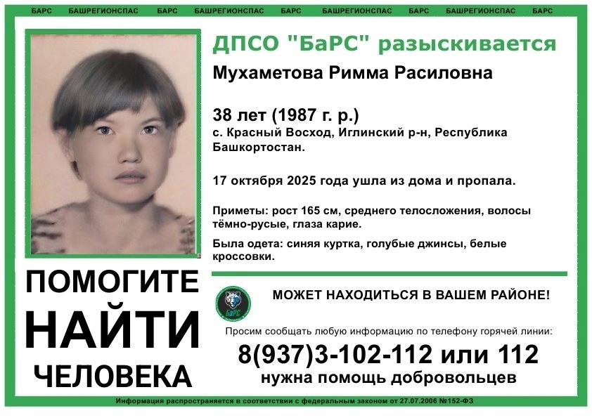 17 октября 2025 года она ушла из дома и не вернулась. Об этом сообщают поископики отряда "Башрегионспас". Известно, что была одета в голубые джинсы, синюю куртку и белые кроссовки.