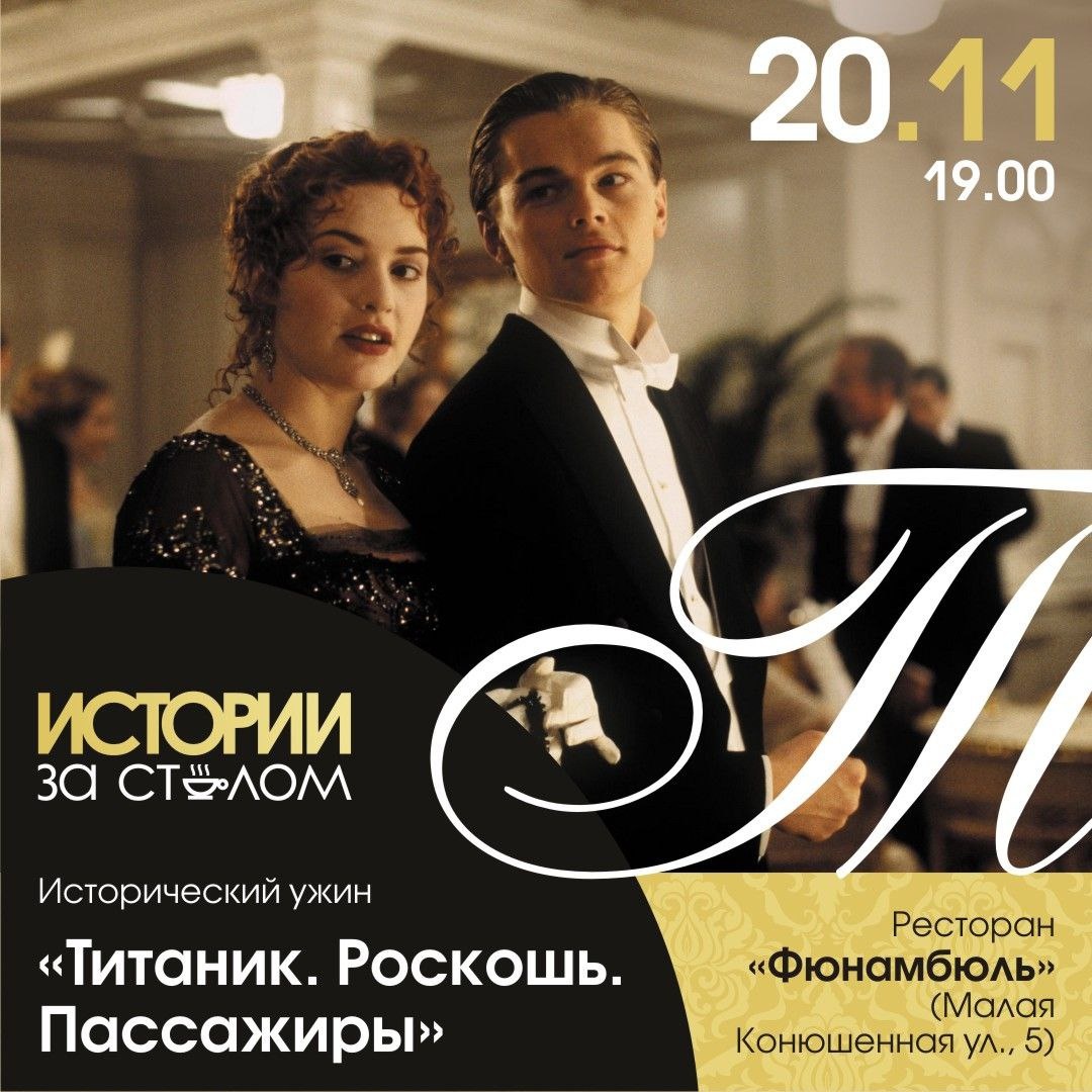 Анонсируем наш роскошный вечер с не менее роскошным меню🔥 Исторический ужин «Титаник. Роскошь. Пассажиры» 20 ноября в 19.00 🧭Ресторан «Фюнамбюль» (Малая Конюшенная ул., 5) Лектор — культуролог Милана Каурин. ⚓Мы погрузимся в историю легендарного океанского лайнера «Титаник». Рассмотрим замыслы и амбиции его создателей, уникальные технические характеристики и инновации, которые сделали «Титаник» «непотопляемым». Поговорим о самых известных пассажирах первого класса, их развлечениях на корабле. Особое внимание уделим гастрономическим изыскам и кухне разных классов, которые предлагались пассажирам. В меню - блюда, которые подавались на последнем ужине на «Титанике»: 1⃣Крудо из сибаса с соусом вьердж; 2⃣Запеченый камамбер с чатни из винограда пломбиром и медом; 3⃣Гратен с ягненком и мятным соусом; 4⃣Сливовый пудинг; 5⃣Бокал игристого вина; 6⃣Чай/кофе на выбор. 📨Стоимость - 5990 рублей. Для записи пишите @AnnaShuniaeva или купите билет на сайте izastolom.ru