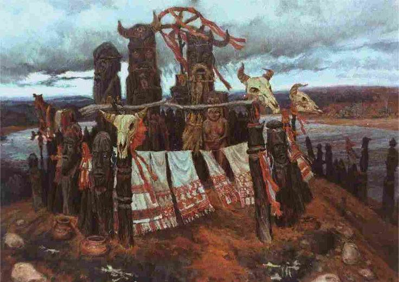 Святослав, будучи опытным полководцем, но не политиком, следовал собственной стратегии. Он мог избежать междоусобицы, но был попросту обманут дворцовыми интригами, организованными варягами и (возможно!) киевским кагалом. В ходе болгарского похода князь был втянут в затяжную войну с болгарами магометанской веры, вассалами иудейской Хазарии и Византии, после чего остро нуждался в помощи, но помощь не пришла. На исходе этой кампании остатки дружины Святослава страдали от ран, голода и холода, не имея никакой поддержки, хотя находились на своей территории, в своей стране. Кто-то намеренно заманивал Святослава в смертельную ловушку. Развязка известна из ПВЛ без подробностей. Святослав, только-только оправившись от ран, мужественно пытался вырваться из блокады, но был захвачен бандой Кури и предан заклятию у Черной скалы на о. Хортица. Какой же он язычник после всего этого? Давайте быть честными до конца: князь Святослав был потомственным воином, далёким от религиозных предрассудков, но ставшим жертвой языческого ритуала.