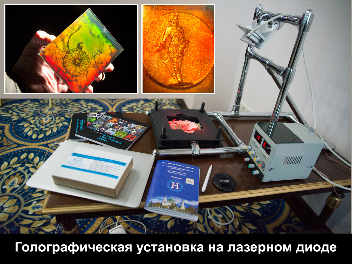 «В 1976 году мне по счастливой случайности удалось побывать в лаборатории голографического кино НИКФИ. Виктор Григорьевич Комар, возглавлявший тогда самое передовое направление в изобразительной голографии, показал мне крупноформатные голограммы, кадры из голографических кинолент, лазеры и познакомил с коллективом своих талантливых сотрудников. Кроме сногсшибательных впечатлений, я привез домой коробочку фотопластинок ПЭ-2 для регистрации отражательных голограмм. Вернувшись из Москвы, я долго искал, где бы раздобыть хоть какой-нибудь лазер, и в конце концов нашел его в политехническом институте. Выпросил на пару дней слабенький гелий-неоновый прибор и с нескрываемым волнением приступил к созданию голограммы по схеме Юрия Денисюка.