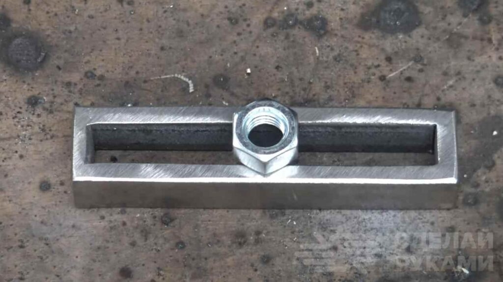 Первым делом нужно отрезать четыре заготовки из металла, и затем сварить из них основную часть нашей самоделки. По центру необходимо будет приварить обычную шестигранную гайку.