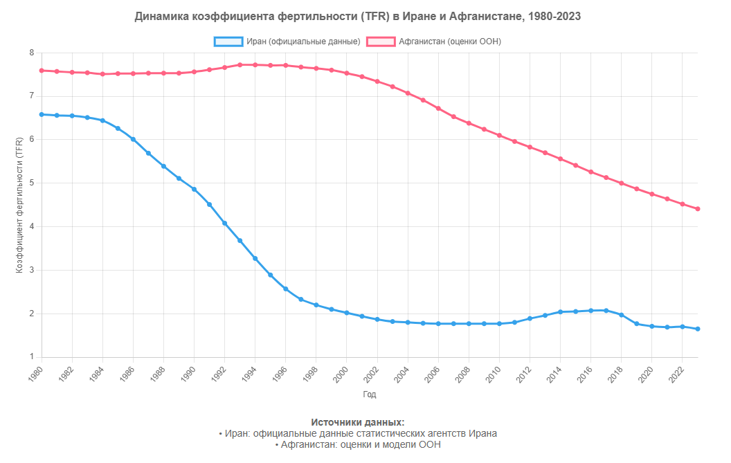 Взгляните на график рождаемости Ирана и Афганистана. Бросается в глаза один поразительный момент: где-то в середине 1980-х годов траектории двух соседних стран резко расходятся. Показатель Ирана начинает стремительно падать, в то время как график Афганистана продолжает оставаться стабильным. Самое удивительное здесь — даже не падение фертильности в Иране, а идеальная плавность афганской кривой. В чём же причина такого контраста? Всё просто, но оттого не менее важно: данные по Ирану — это его собственная статистика. А по Афганистану — это оценочные модели ООН, а последняя достоверная статистика — это перепись населения 1979 года. Кто-то может утверждать, что причина падения рождаемости в Иране — политика по её ограничению. Но эту политику начали проводить только с 1989 года, в то время как, согласно графику, фертильность начала снижаться гораздо раньше. Уже в период с 1984 по 1989 год она сократилась с 6,5 до 5,1. Примечательно, что в это время (с 1980 по 1989 год), наоборот, проводилас