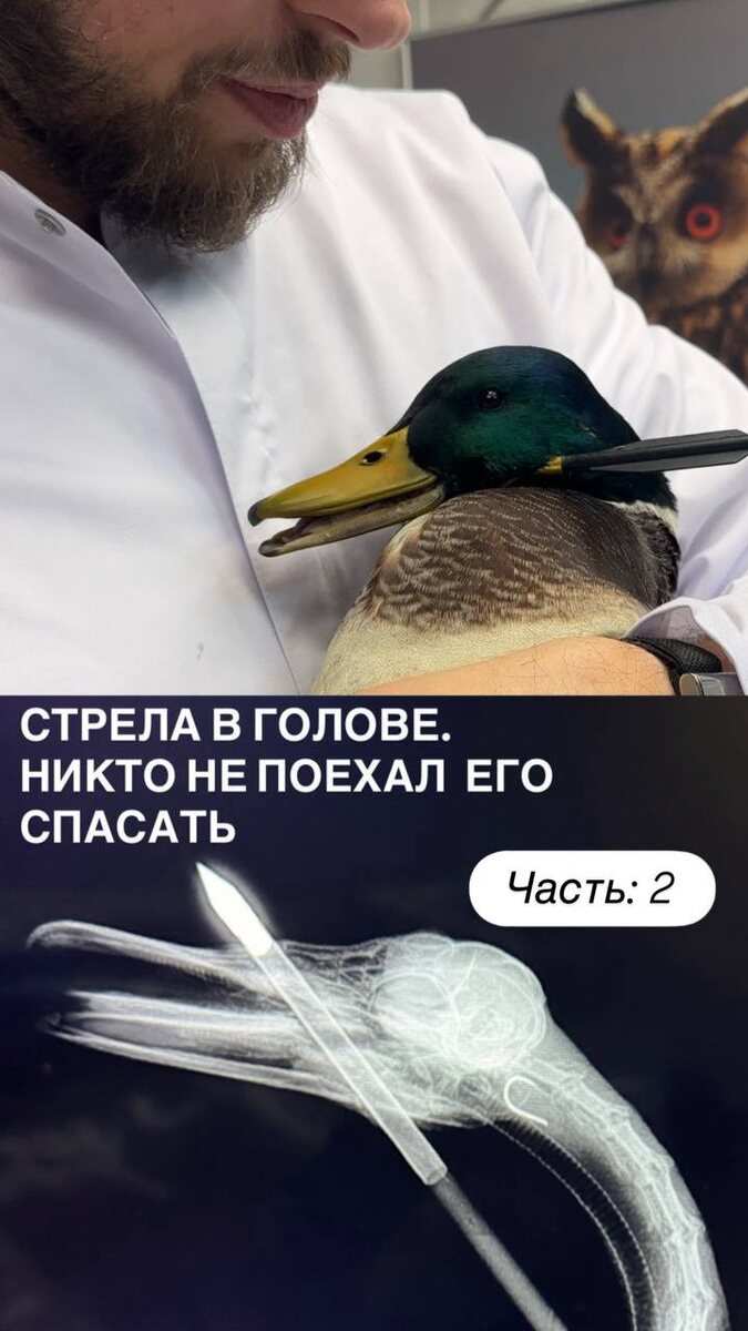 В первой части я рассказал, как все службы отказались помочь. Кто-то не поехал, а те, кто приехали — даже специалисты Московского зоопарка — так и не смогли поймать птицу. Этого селезня подстрелили живодёры. Арбалетная стрела прошла через голову и застряла. После того как мне написали, а потом и позвонили я выехал на место. Селезня удалось поймать и осмотреть. Ранение оказалось тяжёлым, поэтому я сразу приступил к поиску операционной и подготовке к операции по извлечению стрелы. И тут — сюрприз. На рентгене, кроме стрелы, видим рыболовный крючок — глубоко в шейной части пищевода.» Работаем предельно аккуратно. Миллиметр за миллиметром вытаскиваем стрелу, контролируем кровотечение. Есть — стрела вышла. Промывка, антисептик, обработка. Делаем контрольный рентген. И в этот момент он перестаёт дышать. Тишина. Сердце не бьётся. Переходим к реанимации: Секунды тянутся вечностью. Есть — пульс возвращается, дыхание появилось . Мы успели. Возвращаемся к столу и продолжаем работу. Следом