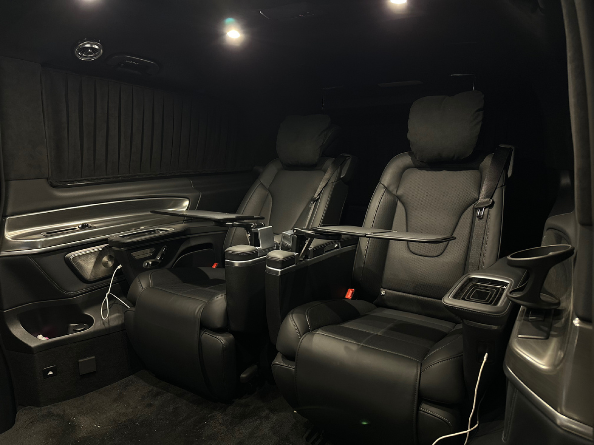 Основные опции: Ультратонкая перегородка: - Монитор 43" (Samsung 4K, SMART TV) с механизмом электропривода - Система дополнительной вентиляции салона в нижней части перегородки - Декоративный молдинг с оригинальными часами Mercedes-Benz. - Зонт в нижней части перегородки Салон: - Установка комфортных капитанских кресел - Дооснащение кресел столиками в подлокотниках - Перешив салона натуральной черной кожей Nappa и черной тканью алькантара с декоративными хромированными элементами - Подсветка Ambilight - Кнопки открытия / закрытия двери - Интерком для переговоров с водителем - Изготовление и установка шторок из алькантары - Точечное освещение на потолке - Воздуховоды круглые с подсветкой Mercedes GT - Блоки управления опциями салона в центральные стойки Дополнительно: - Полная шумо–виброизоляция премиальными материалами - Розетка 220W (для Play Station) - Электропороги внешние (Корея). - Внесение изменений в ЭПТС. - Камера фронтального обзора с выводом на телевизор __________