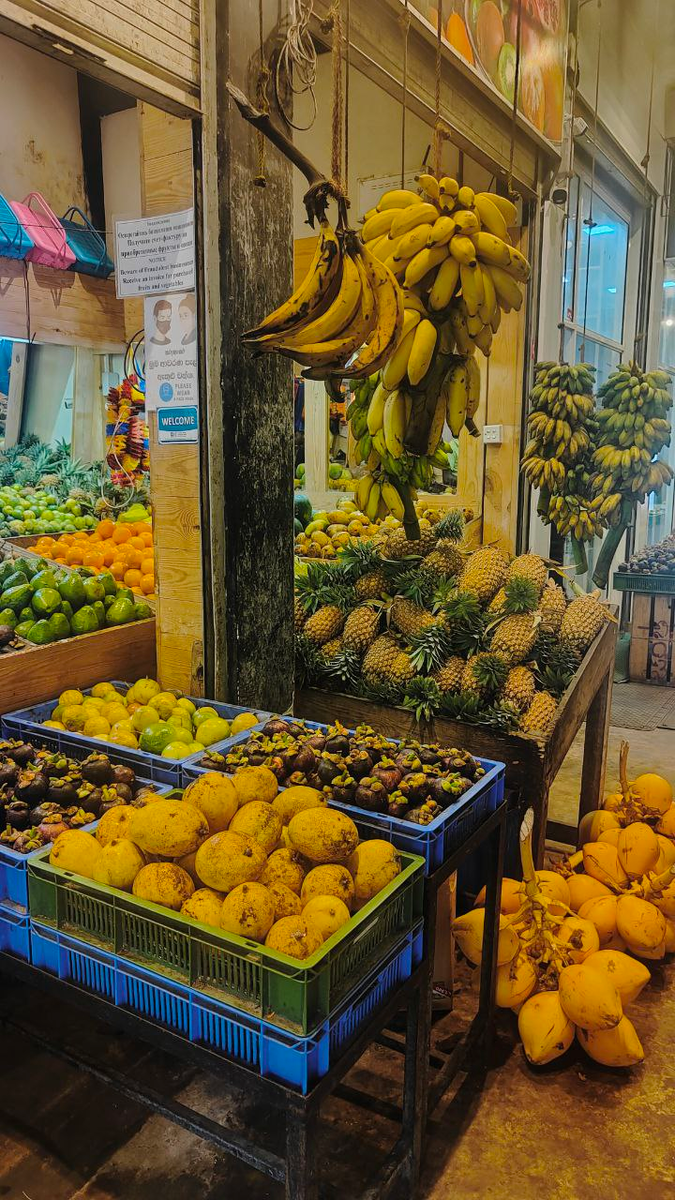 Утро началось с печенья, йогурта и кофе — завтрак эконом-путешественника. С Иркой пошли на разведку к местному рынку. По пути зашли на автобусную станцию уточнить, как ей добираться в аэропорт Коломбо. Ирка завтра меня покидает — печально, но что поделать. Оказалось, всю ночь ходят автобусы с интервалом в 50 минут. С пересадкой в Негомбо — и ты в аэропорту. Такси, конечно, предлагали за $45, но жабка победила — Ирка поедет на общественном транспорте. Героиня! «Фруктовый рынок» — это громко сказано. Под навесами ютится от силы 7 продавцов, и у всех ассортимент одинаковый. Торговаться смысла нет. Купили мангостины по 700, папайю за 250, сахарное яблоко за 1200, дуриан за 750, а карамболу нам так просто и отдали) Дальше пошли на запах жареной рыбы. За углом — три лотка, где зазывалы громко кричат по-русски. Креветки всех размеров, лобстеры, устрицы, кальмары, осьминоги... Цены кусаются: креветки по 1200. В России я покупаю дешевле! Ладно, надеюсь, тут они хоть свежее и вкуснее. Пока жд