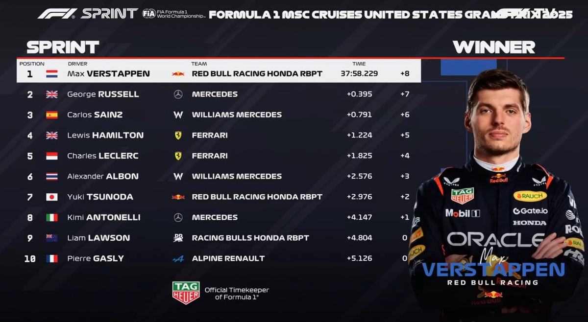 Результаты спринта гран-при США: Ну что, похоже, наконец борьба в команде началась. Что стало триггером — темп Макса или трещины в Папайя Рулс — пока не ясно. Но если всё продолжится в таком духе, то сезон закончится крайне интересно. Стоит отметить и то, что Макларены не смогли из-за всего этого собрать важные данные для гонки. Расселл сегодня не претендовал даже на топ-3, а в итоге за счёт инцидента смог приехать вторым, а третьим финишировал Карлос Сайнс. Это его второй подиум за сезон, хоть и на этот раз только в спринте. Также первый поворот смогли пережить две Феррари. Леклер изначально вырвался вперёд, но впоследствии ошибся, и его обратно прошёл Льюис. Цунода — главный победитель сегодня: с хвоста смог вырваться на седьмое место, хоть и проехал несколько поворотов с дополнительным крылом Хюлькенберга на своём днище. Халк и Алонсо после хорошей квалы находились внутри поворота, когда столкнулись оба Макларена, и в итоге стали главными жертвами инцидента Оскара и Ландо. Ха