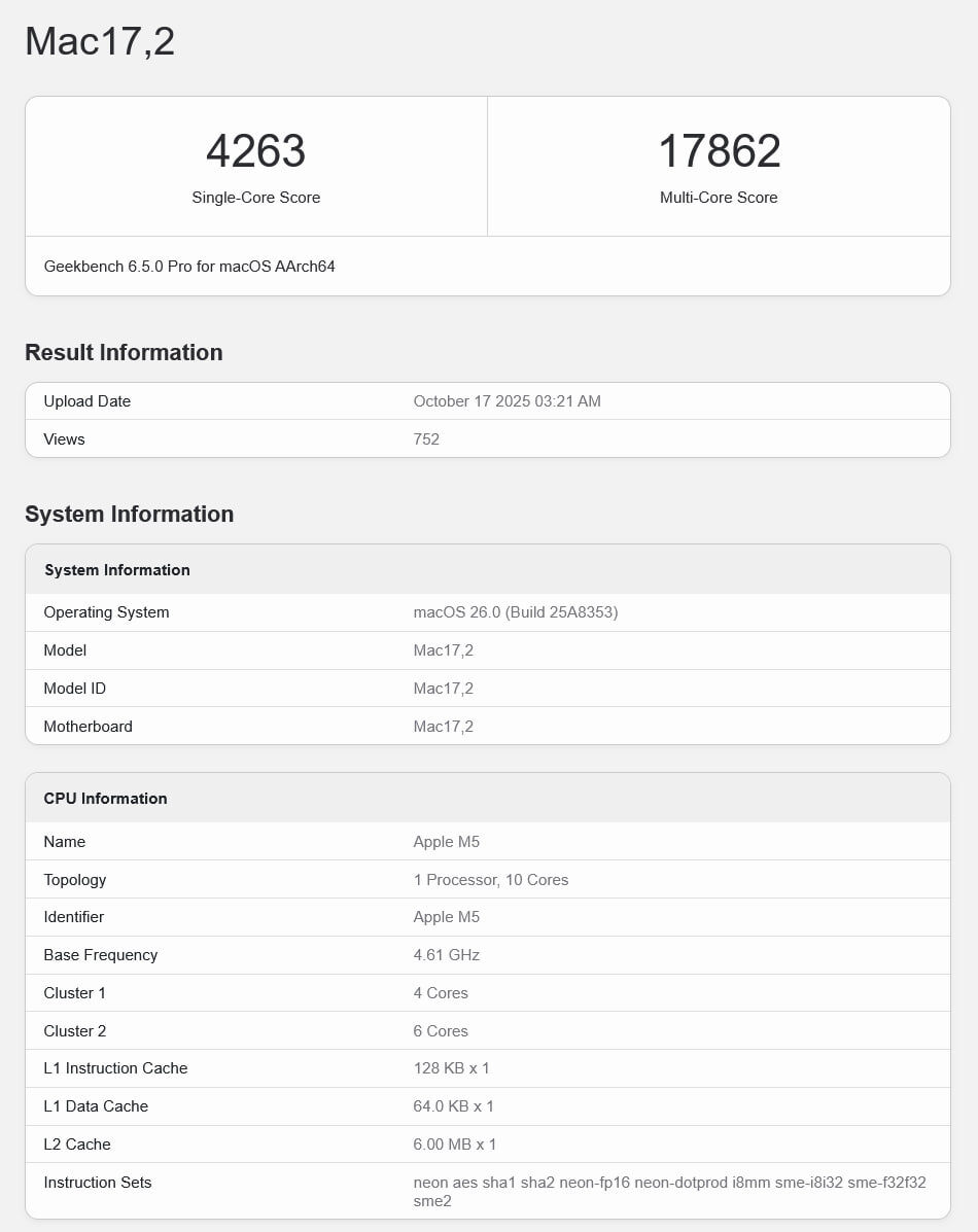 Привет, друзья! Сегодня речь пойдёт о значительном прорыве в мире технологий — новом процессоре Apple M5. Этот чип стал настоящим хитом среди энтузиастов и профессионалов, благодаря своей выдающейся производительности. В бенчмарке Geekbench M5 продемонстрировал впечатляющий результат в 4263 балла на одно ядро, что на четверть превышает показатели мощного игрового процессора AMD Ryzen 9 9950X3D. Новые MacBook Pro и iPad Pro, оснащённые чипами M5, поступят в продажу 22 октября. Это событие обещает стать значительным шагом вперёд в развитии мобильных устройств и их возможностей. Какие устройства на базе Apple M5 вы бы хотели увидеть в будущем? Поделитесь своими ожиданиями и предположениями в комментариях! Не забудьте подписаться на канал «The Collective», чтобы быть в курсе всех технологических новинок и глубоких аналитических материалов. Подписывайтесь на канал ‘The Collective’ – здесь только самое интересное!