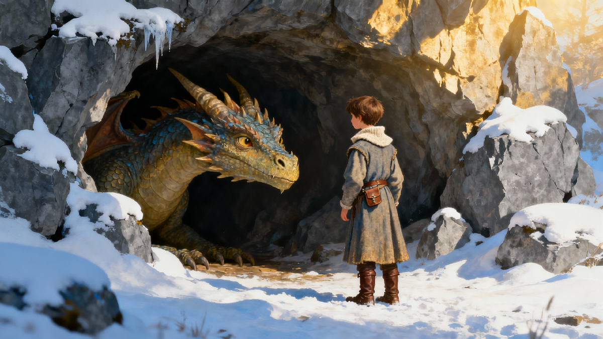 Дорога была трудная: ветер дул сильный, снег колол лицо, а камни под ногами скользили. Но Питер не сдавался. Он шёл и шёл, пока наконец не увидел на вершине большую пещеру. Изнутри доносилось лёгкое, ритмичное дыхание словно ветер играл в огромные трубы. Это было дыхание дракона.