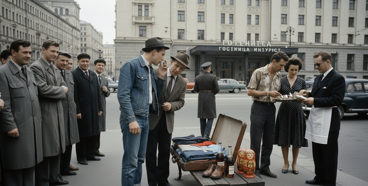 Фарцовка не была хаотичной деятельностью одиночек. Это был настоящий бизнес с чёткой иерархией, разделением труда и многотысячными оборотами. На самом низу пирамиды находились "бегунки" и "рысаки" — молодые ребята, которые непосредственно контактировали с иностранными туристами на улицах, у гостиниц, в кафе. Их задача была проста: завязать знакомство с "фирмачом" (иностранцем), выменять у него валюту, одежду, обувь, косметику на советские товары — водку "Столичную", коньяк "Арарат", икру, сувениры, матрёшки. Работа была опасной: за спиной каждого иностранца могли маячить сотрудники КГБ, готовые схватить нарушителя на месте преступления.