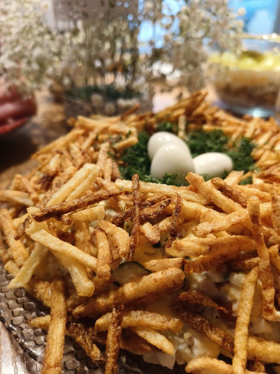 Я не воссоздавала память его детства — я создавала новое воспоминание. Наше. И когда он увидел на столе это «гнездо» с хрустящей картофельной короной и миниатюрными перепелиными яйцами, его реакция была бесценна. Не ностальгия, а чистое, детское удивление и восторг от самого вида блюда. А первый кусочек стал тем самым моментом истины: «Это нечто!». Салат покорил его с первой вилки. С тех пор он прочно занял место главного фаворита на нашем праздничном столе. Он стал не символом прошлого, а нашим личным кулинарным открытием, нашей собственной традицией.