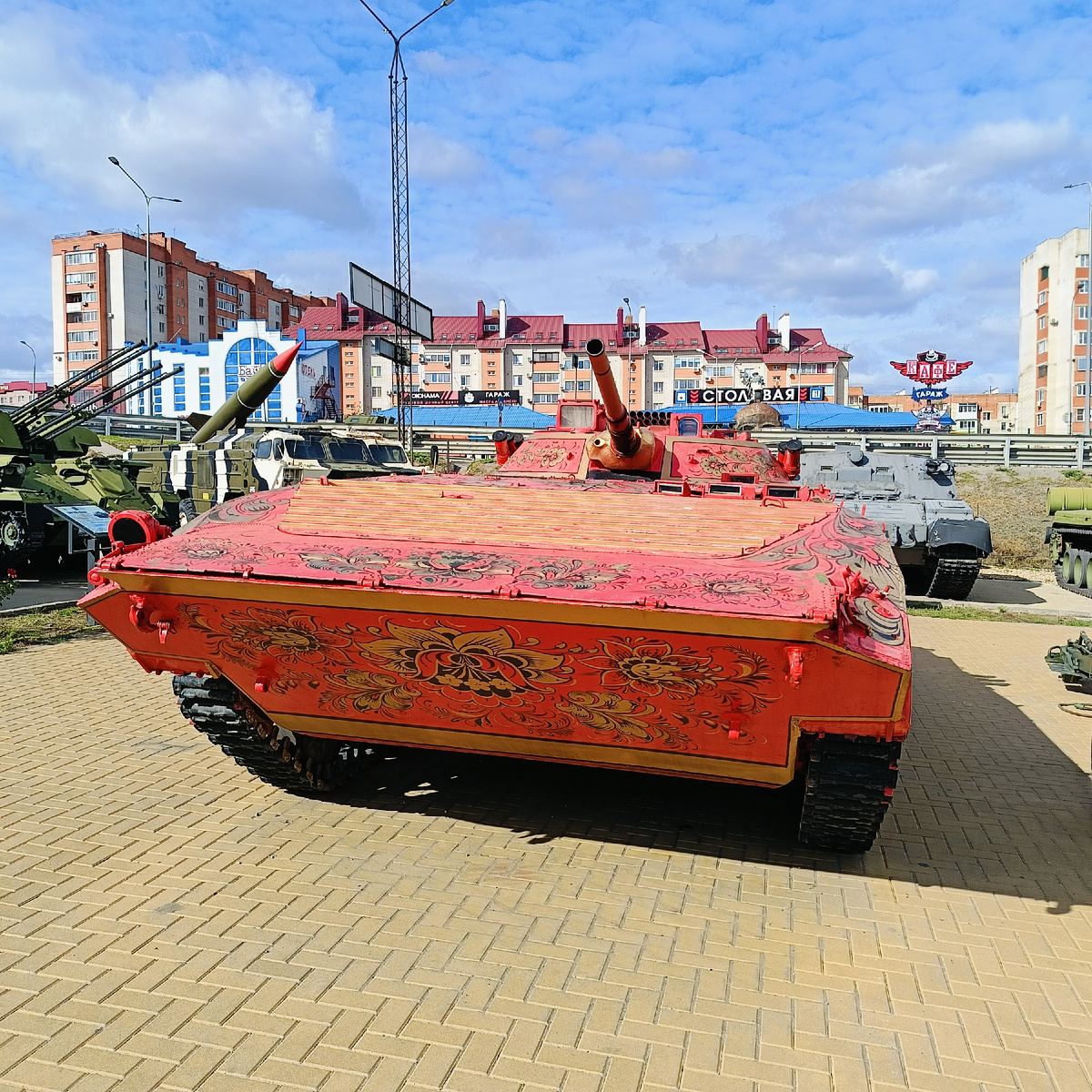 Удалось побывать в парке "Патриот" в Каменск-Шахтинске Ростовской области. Среди представленных экспонатов, многих весьма любопытных, выделяются несколько образцов, расписанных в разных стилях русского народного творчества. Решил вынести их фотографии в отдельную статью - вдруг каким моделистам пригодится. Первым, почти сразу у входа, на глаза попадается красная боевая машина в "камуфляже" типа "хохлома". Во всех источниках она позиционируется как БМП-1 (иногда даже БМП-2!), но широкая двухместная башня, по три "Тучи" справа и слева на башне, по одной амбразуре на бортах (вместо четырех) позволяют предположить, что это боевая разведывательная машина БРМ-1К "Коршун": Правый борт: Башня крупным планом: Корма: Вид на левый борт: Следующий экспонат в "народно-промысловом" камуфляже 76-мм дивизионная пушка ЗИС-3: Еще один экспонат уже в камуфляже типа "гжель" 85-мм дивизионная пушка Д-44: И наконец, "вершина" творчества, ЗАЗ-965 "Запорожец" в хохломе: Техника расписана красиво, с душой. Н
