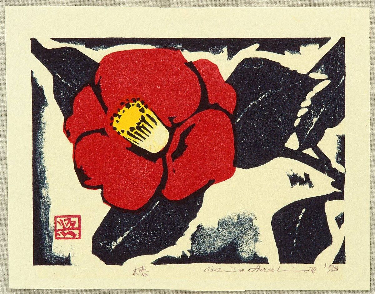 Снова слегка щемит в сердце при виде последнего цветка камелии. Ну что ж, увядай! О камелия, ты леденеешь На холодном ветру — И никто не взглянет печально. Сходны наши с тобою судьбы… Нагацука Такаси; Собрание танка Нагацука Такаси; цикл Песни осени. Перевод с японского языка выполнен А.А. Долиным. Гравюра: Окииэ; «Камелия»; 1972 г. #大和の歌