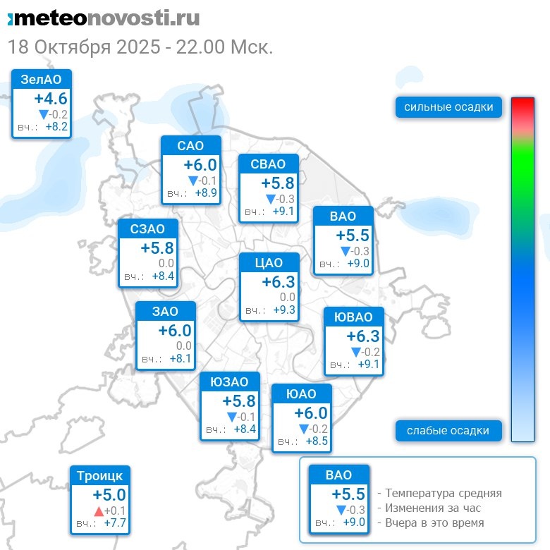 В 22:00 в Москве было от +4.7°C до +6.7°C, средняя температура +5.9°C #погода #Москва #осень #температура #18октября #суббота