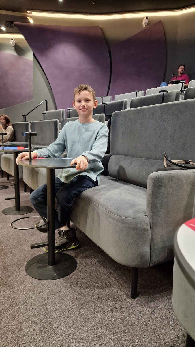 Театр на Цветном — современный, без изысков. Приезжать заранее смысла нет — сидеть негде. Стоять, если честно, тоже, разве что в буфете. Буфет у входа в зал крошечный, ассортимент — тоже. Попкорн (0,7) — 400 ₽, сахарная вата — 400 ₽, бутерброд с икрой — 550 ₽, тарталетка с голубикой — 550 ₽, капучино (300 мл) — 350 ₽. Самое популярное — попкорн: у каждого второго ребёнка. Кстати, что за мода — попкорн в театрах? При этом в зал его проносить нельзя: при нас одна мама спорила с администраторами из-за этого. Мы пришли на премьеру второго сезона шоу «Богатыри». Я думала, что это будет первый новогодний подарок (в октябре, ха-ха) — ведь на сайте обещали «подарок за 990 ₽». Но нет, подарки появятся только во время январских праздников. Эх. Наши билеты были на балконе. Там стоят диванчики на двоих и небольшой столик. — Тут даже есть можно! — восхищались дети. Рома тоже впечатлился, но потом расстроился, что меню ограничено напитками и десертами. Зато во время антракта все же соблазнился на та