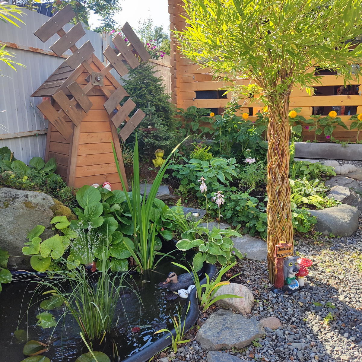 Сейчас наш пруд — настоящая жемчужина участка! Рядом поставили уютную качель, и теперь это наше любимое место для отдыха и релакса. Сидишь, слушаешь журчание фонтанчика, наблюдаешь за рыбками — и весь стресс как рукой снимает!