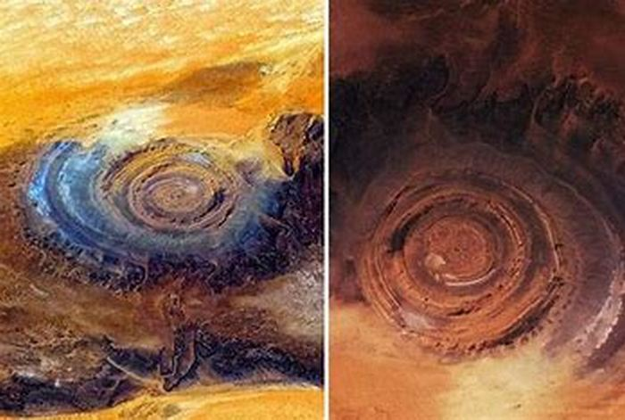 На изображениях, сделанных из космоса, «Глаз Сахары» изображен цветным. Причем цветовые оттенки чередуются определенным образом, формируя те самые концентрические круги. Это происходит благодаря их конкретному происхождению и материалу, из которого они сформировались.