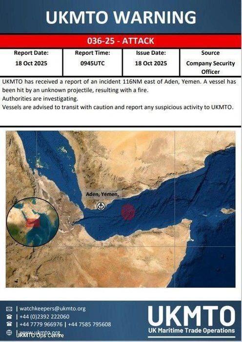 Шедший из Приморска танкер подал сигнал бедствия у берегов Йемена после взрыва на борту. По данным UK Maritime Trade Operations, танкер был поражен из неизвестного снаряда, результатом стал взрыв и пожар. Инцидент произошел в 110 км южнее города Ахвар. Команда запросила помощь и планирует покинуть судно. В заливе начата поисково-спасательная операция. Судно шло под флагом Камеруна. Портом назначения указан город Вадинар, Индия. Ein Tanker aus Primorsk gab nach einer Explosion an Bord ein Notsignal vor der Küste des Jemen. Nach Angaben der britischen Seehandelsoperationen wurde der Tanker von einem unbekannten Projektil getroffen, das Ergebnis war eine Explosion und ein Feuer. Der Vorfall ereignete sich 110 km südlich der Stadt Ahvar. Das Team bat um Hilfe und Pläne, das Schiff zu verlassen. In der Bucht hat eine Such- und Rettungsaktion begonnen. Das Schiff segelte unter der Flagge Kameruns. Der Zielhafen ist die Stadt Vadinar, Indien.