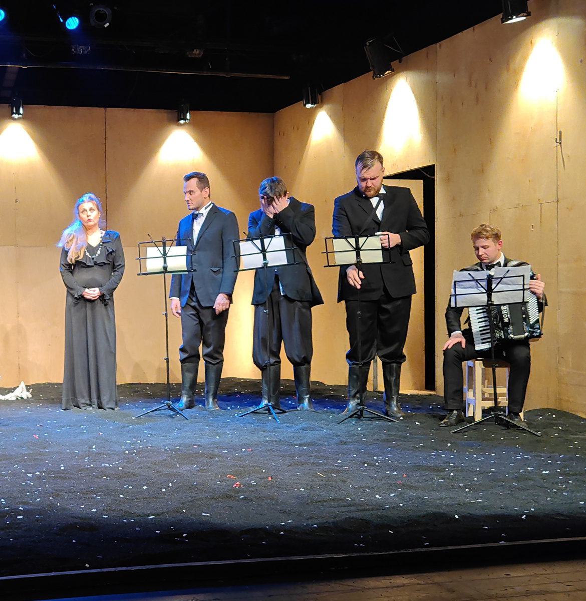 И отдельно про Веру Каншину. Лилия Волкова – главный паровоз постановки, эмоции ее героини либо подхватываешь и спектакль нравится, или не подхватываешь, и спектакль мимо или не нравится. А Вера Каншина – это начальник аж трех станций, на которых останавливается паровоз. Три офигительных и очень разных персонажа в исполнении Веры Васильевны! 1) Замумуканная пожилая соседка, пытающаяся приврать Жанне про последние минуты отца, хотя ложь никому не нужна. О, я знаю, знаю этот тип женщин, которым надо, чтобы все выглядело прилично, даже если для этого надо соврать! 2) Огонь-дама лет на 20 моложе соседки из предыдущего пункта. Крутит своими молодыми красавчиками-подчиненными и явно получает от этого удовольствие. 3) Служительница крематория. Самый смешной и укуренный эпизод спектакля, мой любимый. Как рвется вперед маленькая героиня, как ей жизненно необходимо толкнуть речь (никому, кроме нее, естественно, не нужную). Восхитительный абсурд!