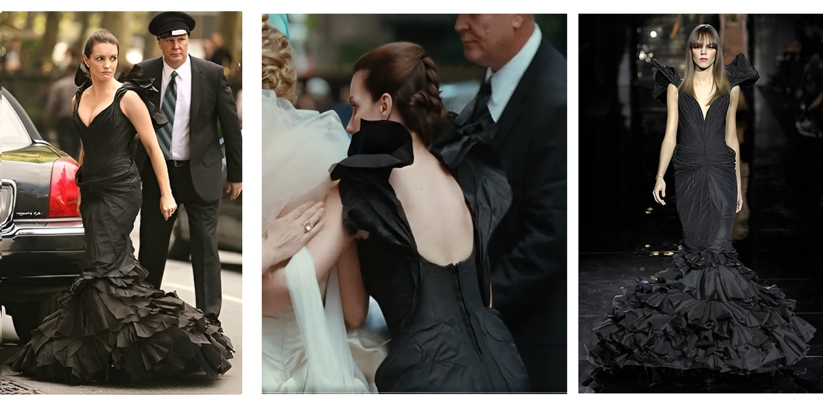 Кто внимательно смотрел сериал с Сарой-Джессикой Паркер, видели оригинал этого платья на несостоявшейся свадьбе Кэрри. Оригинал сделал Зак Позен для Шарлотты и это был "Черный лебедь"