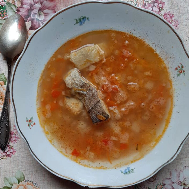 ✔ Филе минтая - 200 г; ✔ Картофель - 1 шт.; ✔ Репа – 1 шт. (~100 г); ✔ Сельдерей – 1-2 стебля; ✔ Корень петрушки - 30 г; ✔ Корень пастернака - 30 г; ✔ Морковь - 1 шт.; ✔ Лук - 1 шт.; ✔ Болгарский перец - 1 шт.; ✔ Помидор - 1 шт.; ✔ Чеснок - 1 зубчик; ✔ Вода: 750-800 мл; ✔ Масло растительное (для жарки)- 1 ст.л.; ✔ Перец горошком, лавровый лист, соль. Чистим картофелину и репу, режем на кубики. Филе моем и режем на кусочки. Моем и чистим лук, морковь и сельдерей. Лук мелко шинкуем, морковь и сельдерей трем на тёрке. 750-800 мл воды ставим на плиту. В закипевшую воду кладём картофель и репу, через 3 минуты - кусочки рыбы и коренья петрушки и пастернака, и перец горошком. Обжариваем лук, добавляем морковь, мелко нарезанный перец и помидор, и тушим до готовности, в самом конце добавляем мелко рубленный чеснок. Через 15 минут варки супа содержимое сковороды отправляем в кастрюлю. Варим ещё 5-7 минут. Можно добавить промытого геркулеса, но не обязательно. Добавить лавровый лист и выключить