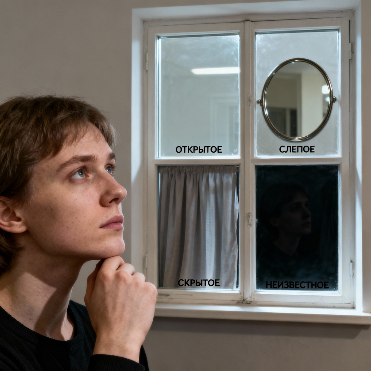 4. Неизвестная область (Тёмная комната) 🌑 То, что не знаете ни вы, ни другие. Скрытые таланты, непроявленные ресурсы, глубинные травмы, которые ещё не всплыли. Это область потенциала и бессознательного, которая может открыться через терапию, кризисы, новый опыт.