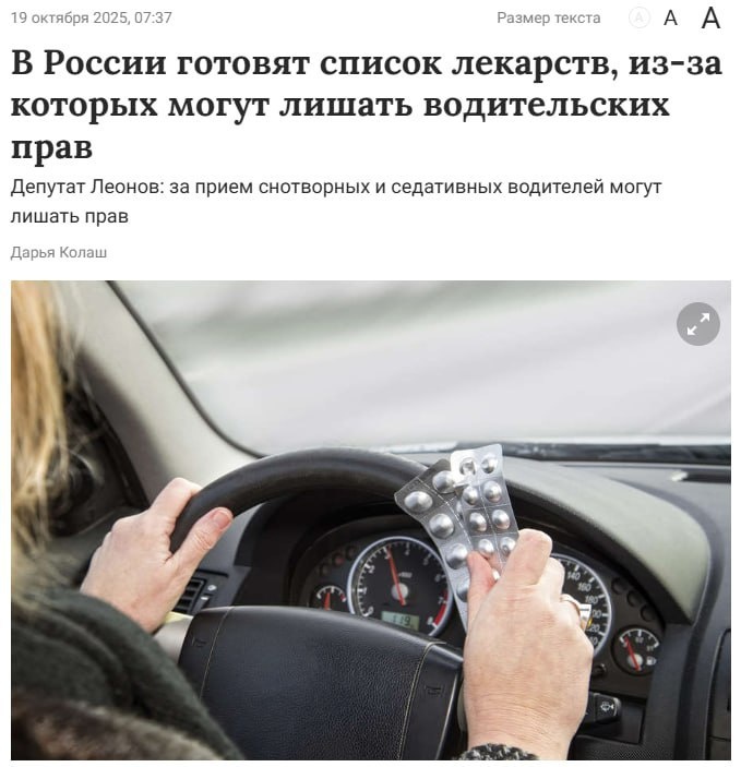 💊 В России планируют штрафовать водителей за снотворные и успокоительные за рулём — Госдума одобрила законопроект в первом чтении. За езду под воздействием таких лекарств грозит 45 тысяч рублей штрафа и лишение прав на срок от полутора до двух лет. Правительство утвердит список опасных препаратов — в него попадут средства, которые замедляют реакцию и мешают концентрации. Наказывать будут только при наличии клинических признаков опьянения, установленных медосмотром. Депутаты предлагают маркировать упаковки надписью «противопоказано при вождении», чтобы водителям не пришлось искать препарат в списке.
