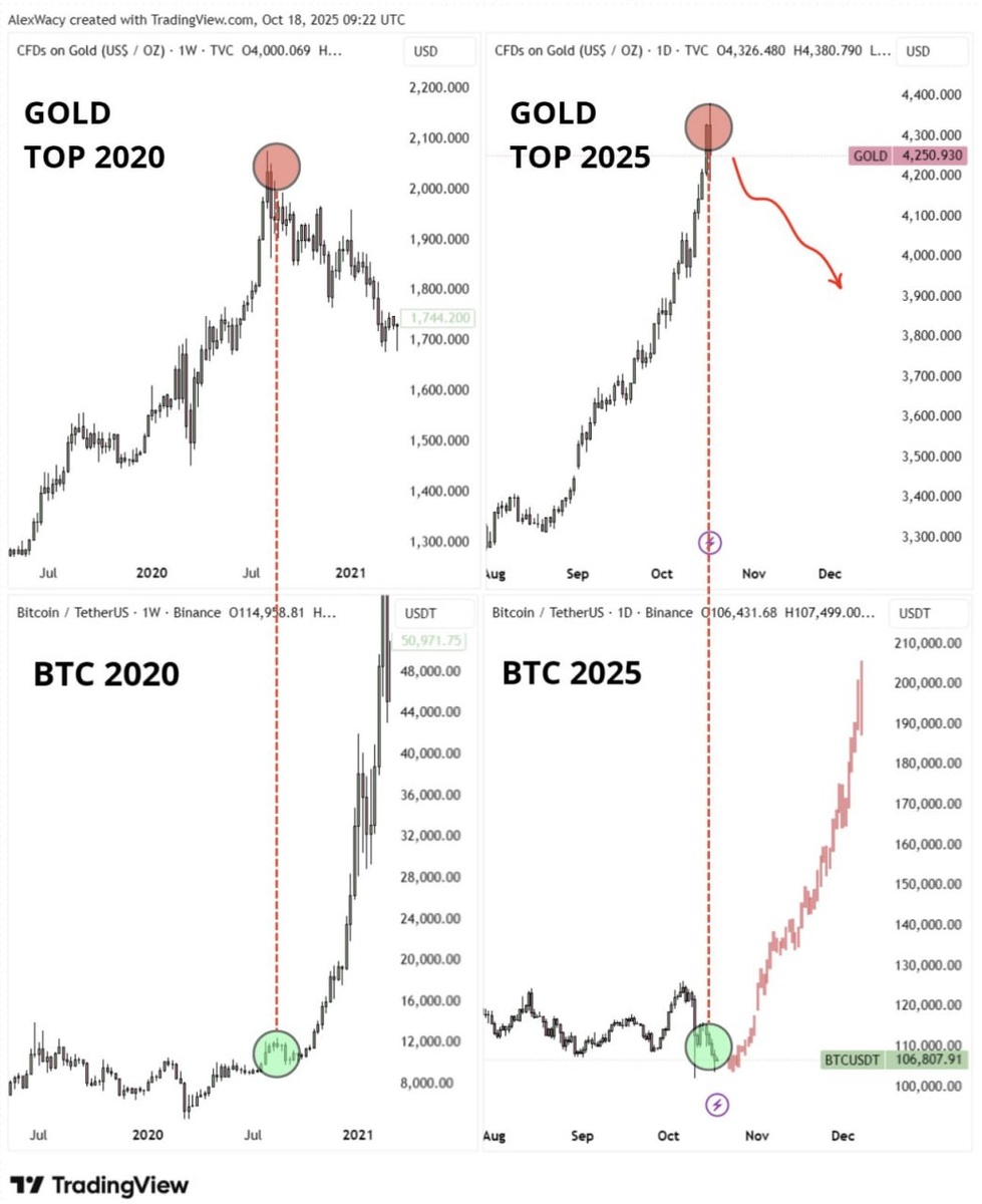 Сейчас — мы снова видим похожую картину: золото обновляет исторический максимум, а биткоин выглядит перепроданным.