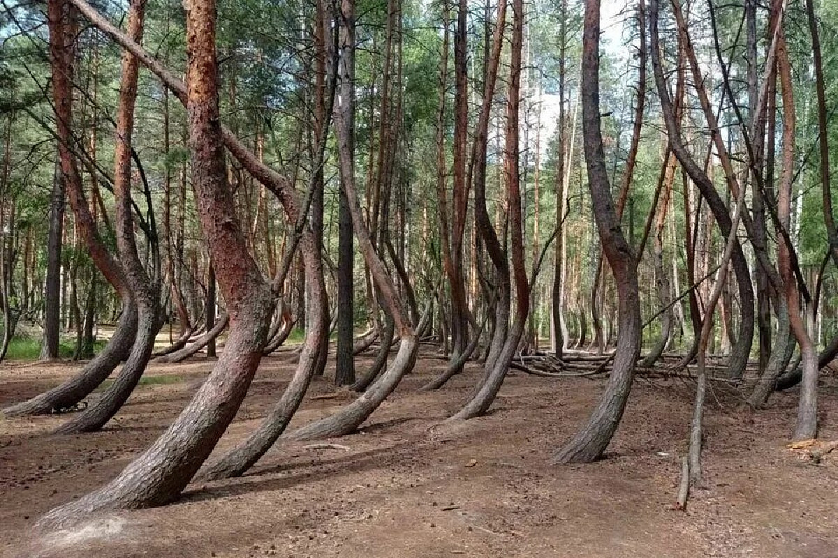 деревья образуют причудливые изгибы, происхождение которых остаётся необъяснимым для науки.