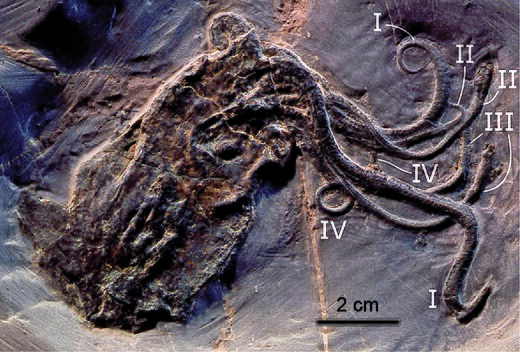 Пост в соцсетях, вызвавший резонанс, ссылается на окаменелость возрастом 296 млн лет из отложений Мазон-Крик и задаётся вопросом: как животное с тремя сердцами, голубой кровью, способностью менять форму кожи и близким к инопланетному уровнем интеллекта может считаться «местным»? Попробуем разобраться, сопоставив идеи сторонников теории инопланетного происхождения головоногих моллюсков с мнением настоящих исследователей. Образец из Мазон-Крик, который часто упоминается в интернете, — это Pohlsepia mazonensis. Он относится к позднему каменноугольному периоду (~296 миллионов лет назад). В некоторых ранних работах его описывали как существо, похожее на осьминога. В более поздних работах высказывалось предположение, что его родство с осьминогами неясно. Другими словами, это интригующий, но не бесспорный «первый осьминог». В 2022 году появились более убедительные доказательства: палеонтологи описали Syllipsimopodi bideni, вампиропода (группа, в которую входят осьминоги и кальмары-вампиры), в