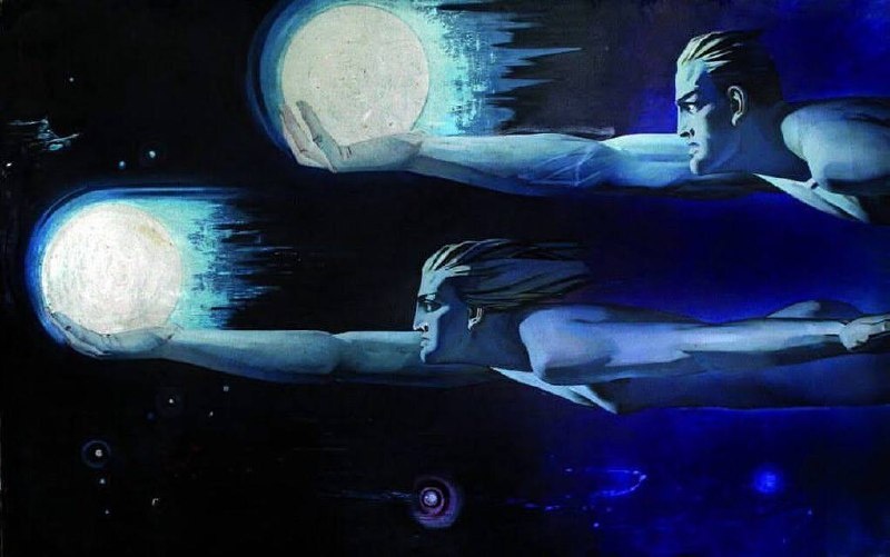 Таир Салахов «Тебе, человечество!» 1961 год. Но помимо величайших трудовых подвигов сотворенных, воодушевившимся идеей народом, а так же возможности стремиться ввысь, открывая новые горизонты, коммунистическая идея дала человечеству главное Она ответила на вызов смерти жизнью, бессмертием Человек перестал быть заложником одиночества, открывшись, обрел большую семью, познал, что значит товарищество, братство Человек стал созидать новый мир, пошел навстречу своей мечте и умирал за свободную волю вместе с братьями Чувство братства и вера в общее дело наполняли его силой Дыша полной грудью, человек воспел жизнь в деле, в труде, в подвиге Видя будущее за коммунистической идеей, большевики верили в расцвет человечества, верили в нового, освобожденного от волчьей грызни, человека Да, возможность полета в космос стала великим завоеванием человечества, но это был только первый шажок на пути к величайшим открытиям Глубоко гуманистическая идея коммунизма не ограничивалась научными открыти