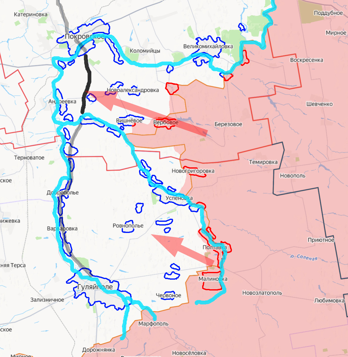 Условно: Покровское направление - на север от Успеновского оборонительного района противника, Гуляйпольское направление - на оборонительный район и на юг от него. Цели ВС РФ на данных направлениях: 1) - Установив контроль над большей частью междуречья Янчура и Волчьей, перерезать трассу Покровское - Гуляйполе, лишив таким образом противника ключевой рокадной дороги на направлении, а также значительно усложнив положение гарнизона ВСУ в Гуляйполе. 2) - Со стороны междуречья Янчура и Волчьей атаковать на Покровское, лишив противника важнейшего логистического узла и значительно удлиняя ему плечо логистики в масштабах всего южного фронта. ЛИБО 2) - Со стороны междуречья Янчура и Волчьей наступать на юг, в сторону города Гуляйполе, параллельно с атакующими действиями от Полтавки и Малиновки. Установить контроль над значительной частью правобережья Гайчура, откуда впоследствии наступать на запад, глубоко охватывая Гуляйполе. Завершается освобождение Полтавки, зачищен восточный берег Янчура