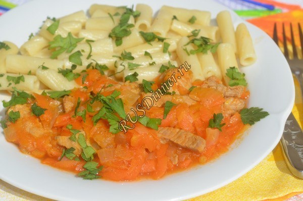 Гуляш из свинины Ингредиенты: Свинина - 500 гр. Лук репчатый - 3 шт. Морковь - 300 гр. Томатная паста - 50 мл. Соль - 10 гр. Перец черный молотый - 10 гр. Чеснок - 3 зуб. Вода - 300 мл. Масло растительное - 30 мл. Петрушка - 1 пуч. Источник: https://rusdinner.ru/page/guljash-iz-svininy