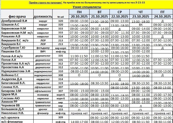 Актуальный график работы врачей с 20 октября • Городской поликлиники; • Детской поликлиники; • Стоматологической поликлиники; • Женской консультации. Возможны изменения. Уточняйте расписание на официальных ресурсах или по телефону кол-центра: 9-23-33. 👉 Типичный Снежинск