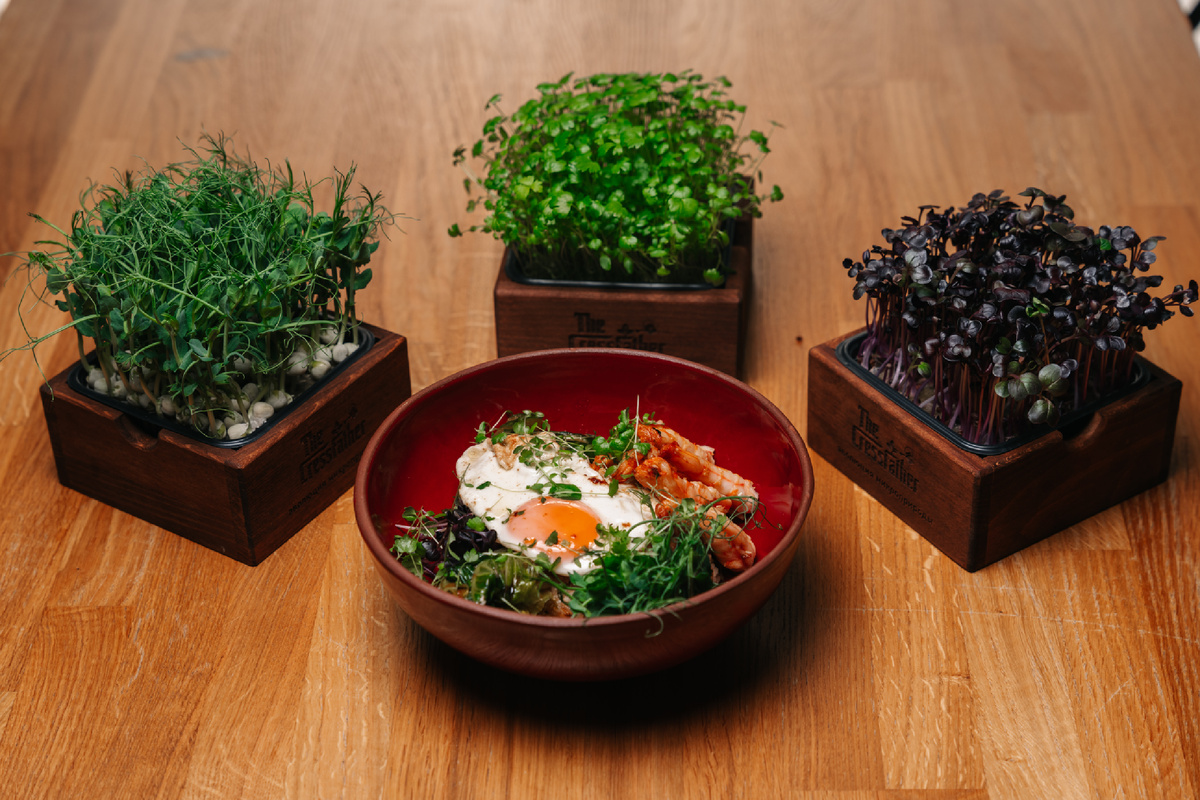 Ароматный жареный рис с креветками, яркий салат из романа и микрозелени, яичница с жидким желтком и свежий акцент сельдерея — блюдо, где Корея встречается с гастроэстетикой CressFather