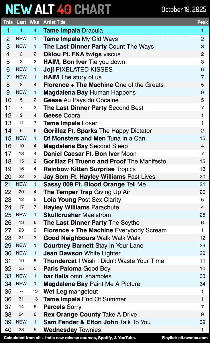 Tame Impala - «Dracula» четвертую неделю в чарте, третью - на первом месте, сингл является третьим превью их альбома Deadbeat, вышедшего на этой неделе. «Ночь почти закончилась, я все еще не знаю, где ты. Тени, да, они делают меня красивым, как кинозвезду. Дневной свет заставляет меня чувствовать себя Дракулой», — поет Кевин Паркер в этой бодрой, зловеще кинематографичной композиции, к которой снят клип режиссера Джулиана Клинцевича.