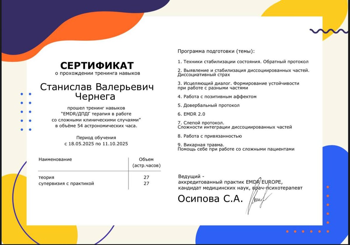 🪬Друзья, важная новость! 🎓 С гордостью сообщаю, что успешно завершил обучение по программе «EMDR/ДПДГ терапия в работе со сложными клиническими случаями»! За 54 академических часа интенсивного обучения я получил новые инструменты и техники работы с травматическим опытом и сложными психологическими состояниями. 🔄 Это ещё один шаг в моём профессиональном развитии, который позволит мне ещё эффективнее помогать вам в решении ваших запросов. ❤️ Готов встретиться с вами на консультации и помочь проработать сложные жизненные ситуации с помощью современных и проверенных методов терапии. Записывайтесь на консультацию прямо сейчас! 📩 https://taplink.cc/11437529