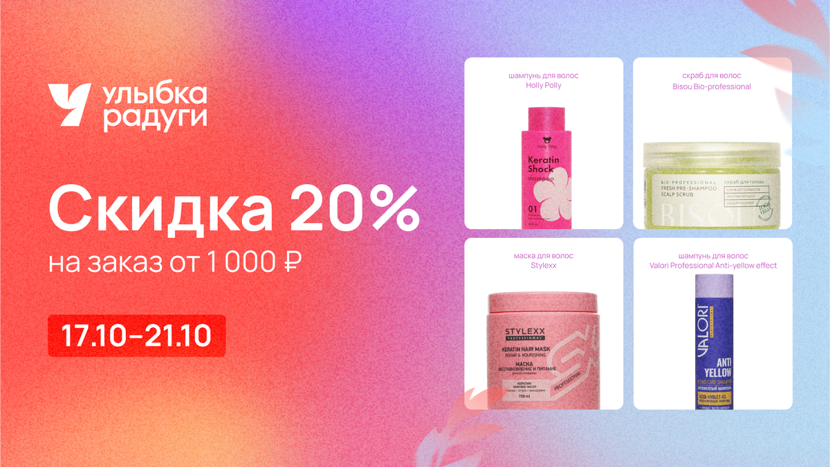🌈 Скидка до 20% в Улыбке Радуги 🤩 Собирайте корзину c 17.10 по 21.10 🔥 👉🏼 Переходите по ссылке: https://gtblg.ru/ajaj6H?erid=2SDnjdsvN1m
