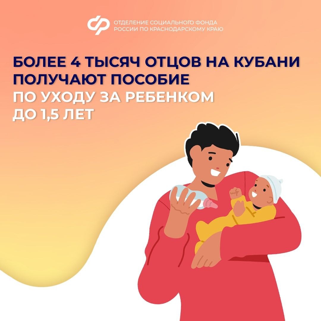 Папы тоже имеют право на поддержку! ❤️ 👨🍼 Пока папа ухаживает за малышом, Отделение Социального фонда России по Краснодарскому краю выплачивает 40% от среднего заработка за два предыдущих года — до тех пор, пока ребёнку не исполнится 1,5 года. ✔️ Кто может получить пособие? Ежемесячное пособие по уходу за ребёнком доступно работающим гражданам, оформившим отпуск по уходу за ребёнком до 3 лет. Обратиться за выплатой может не только мама, но и папа, а также другие родственники или опекуны, находящиеся в отпуске по уходу. 🟠С 2024 года родитель может досрочно выйти на работу, продолжая получать пособие до 1,5 лет ребёнка. 💸 Размер пособия: Минимальный: 10 103,83 ₽ в месяц Максимальный: 68 995,48 ₽ в месяц Отпуск по уходу за ребёнком до 1,5 лет засчитывается в стаж папы и формирует индивидуальные пенсионные коэффициенты (ИПК): 1,8 ИПК — за первого ребёнка 3,6 ИПК — за второго 5,4 ИПК — за третьего и четвёртого 🎉 Поздравляем всех пап с Днём отца! 🧸 «Ваша забота и поддержка — ос