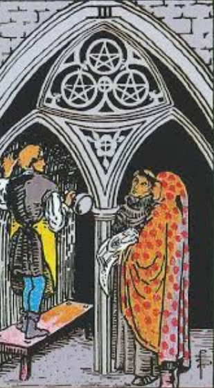 Совет: пользуйтесь выпавшей благоприятной возможностью. Поглядим. Что видишь? На карте изображены трое людей: ремесленник в процессе работы и два человека, наблюдающие за ним, вероятно, заказчики или наставники. Ремесленник выбивает символ на пентакле на стене, демонстрируя мастерство. Цвета. 🌍 Общее значение Прямое положение: