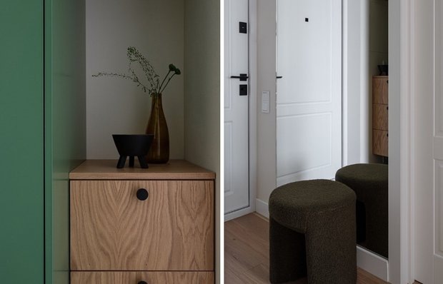 Простота и природные оттенки сделали компактное пространство по-настоящему уютным Как и во всей квартире, дизайнер Анна Мальцева выстраивала прихожую вокруг идеи спокойствия и комфорта. Здесь нет сложных конструкций — только логика и эргономика. Пространство задумывалось как место, где можно ненадолго остановиться, снять рюкзак и переключиться с городского шума на тишину. Несмотря на скромные размеры, входная зона получилась выразительной и целостной. Вдохновляйтесь и берите на вооружение интересные идеи. Главным элементом стал высокий шкаф глубокого зеленого оттенка: он не просто функционален, но и визуально структурирует пространство как акцентный штрих на нейтральном фоне стен и дверей. Оттенок объединяет прихожую с кухней, где также использованы зеленые фасады. Внутри шкафа спрятаны полки для верхней одежды и бытовых мелочей, а рядом — встроенная секция из шпонированного дуба с выдвижными ящиками, где удобно хранить ключи, перчатки и документы. Анна продумала композицию так, чтобы