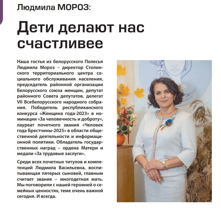 🙏Мама 5 детей и ... директор, депутат, делегат ВНС, «Женщина года-2023» Людмила Мороз о том, как всё успеть В Неделю родительской любви мы публикуем разговор с удивительной женщиной, которая на своем примере доказывает: любовь к семье — главный источник сил для великих дел. ⬇️⬇️⬇️ Её история — лучший ответ на вопрос о балансе работы и семьи. Читайте по этой ссылке.
