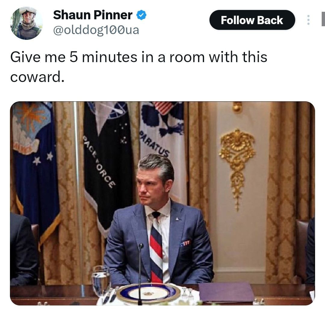 В ответ на пост Shaun Pinner fought for Zelensky before being captured by Russia Brit spent 5 months in prison before being exchanged Now he’s out, he feels cocky enough to threaten Hegseth over his tie
