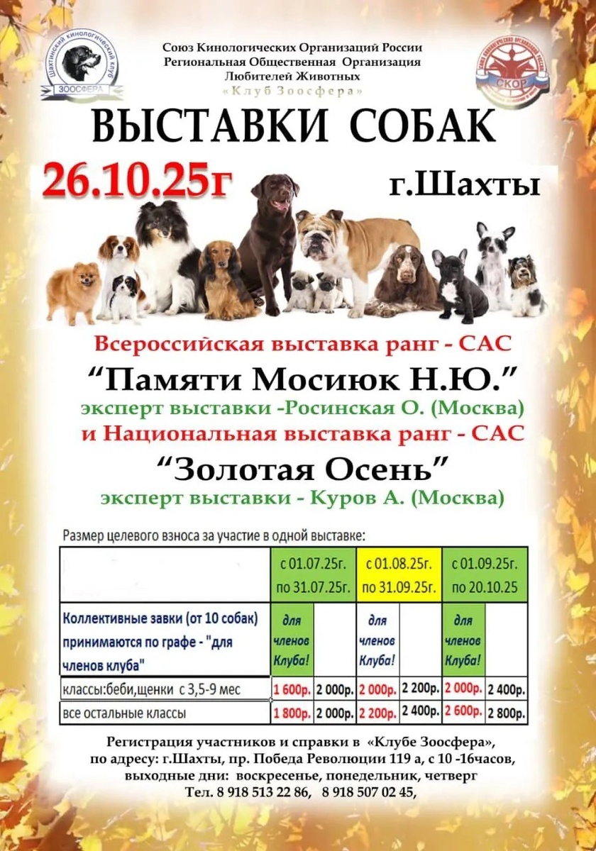 ⏰ 26 окт (7д) 🏛 #Шахты #РостовНаДону #Россия #Выставка 🐶 Выставка собак: Кинологический клуб «Зоосфера» 🏆 Кинологический клуб «Зоосфера» Контакты организаторов здесь: 🌐 https://www.petsman.ru/vystavki-sobak.php?mesto=2852-shakhty Всероссийская выставка собак всех пород «ПАМЯТИ МОСИЮК Н. Ю. » CAC - IKU Национальная выставка собак всех пород «ЗОЛОТАЯ ОСЕНЬ» CAC-IKU 🧑 👨 Эксперты: 🔹 Ольга Росинская 🔹 Алексей Куров