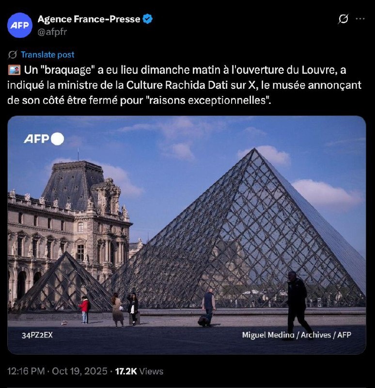Лувр ограбили, пишут французские СМИ. Музей закрыт, ведётся расследование, составляют полный список всего, что украли.