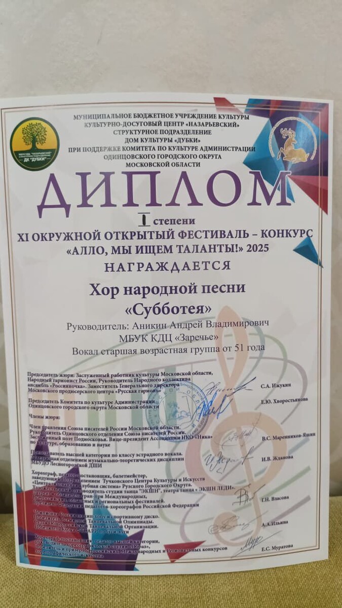 18 октября наш хор народной песни "Субботея" принял участие в Открытом фестивале - конкурсе "Алло, мы ищем таланты" в ДК Дубки. 🏆 🔥 Хор народной песни "Субботея" - 1 место за песню 🥇 Квартет солистов хора Ефимова Нина, Кичигина Мария, Солосина Татьяна и Котельникова Лидия - 1 место. 🥇 Солистка хора народной песни "Субботея" Солосина Татьяна - 1 место. 🥇 Дуэт Кичигина Мария и Котельникова Лидия - 1 место. 🥇 👏 Поздравляем с победой!!! 🏆 🎊 🎉 🔥 Яркий финал конкурса! 🏁 #кдцзаречье #культура_одинцовскийгородскойокруг #культуравзаречье #культура #ОГО #культураОГО #конкурс #вокал #ХорСубботея
