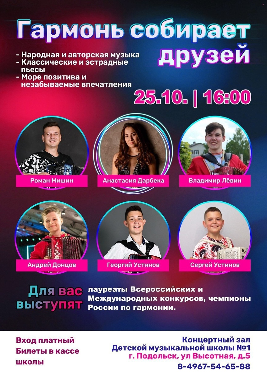 ✨ Концерт "ГАРМОНЬ СОБИРАЕТ Друзей" Для вас выступят Лауреаты Всероссийских и Международных конкурсов 👉Сергей Устинов (г.о. Подольск) и Андрей Донцов (г.о. Люберцы), 👉Чемпион России по гармони - Георгий Устинов (г.о. Подольск), 👉Чемпион России по гармони - Владимир Лёвин (студент РАМ им. Гнесиных), 👉выпускница РАМ им. Гнесиных по классу домры - Анастасия Дарбека (г. Москва), 👉выпускник РАМ им. Гнесиных по классу гармони - Роман Мишин (г.о. Люберцы)! 🎫 Билеты можно приобрести в кассе школы в день концерта. 🚫 Возраст: 6+ 📆 25.10.2025 🕒 16:00 🏢 Детская музыкальная школа №1 📍 г. Подольск, ул. Высотная, 5/12 💰 Цена: 400 ₽ ⭐Поддержать канал голосом 💰 Вакансия - курьер в Подольске ✅ Мероприятия Подольск https://dzen.ru/id/66ed500f7b5671493eca3fd6 http://vk.com/podolsk_events http://dzen.ru/podolsk_events