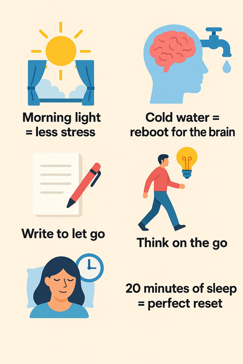Сегодня интернет переполнен «лайфхаками», но далеко не все из них стоят внимания. Зато есть те, эффективность которых подтверждена реальными научными исследованиями. Вот 5 таких примеров 👇 1. ☀️ Утренний свет = меньше стресса Учёные из Университета Колорадо выяснили: если утром хотя бы 10 минут провести на естественном свете, выровняется уровень мелатонина и кортизола, а значит — будет легче просыпаться и меньше нервничать днём. Совет: открывай шторы сразу после пробуждения — мозг «включится» быстрее, чем от кофе. 2. 💧 Холодная вода — перезагрузка для мозга Кратковременное умывание холодной водой или прохладный душ активирует симпатическую нервную систему и повышает уровень норадреналина — гормона бодрости. Совет: если чувствуешь усталость — умывание холодной водой поможет мозгу «сбросить» сонливость. 3. 📝 Запиши, чтобы отпустить Исследования Стэнфорда показали: когда человек записывает тревожные мысли на бумагу, активность в миндалевидном теле мозга снижается — тр