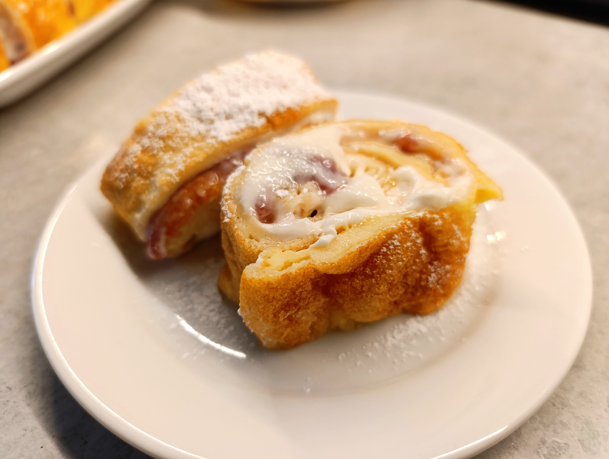 Очень легкий и быстрый завтрак. Выпекается один большой блин в духовке. Можно нарезать его на квадраты, полить сгущенкой или джемом и есть как обычные блинчики. Я свернула рулетом, промазав творожным кремом. Так же можно сделать несладкий вариант. Ингредиенты: Мука 200 гр., Яйцо 3 шт., Разрыхлитель 0,5 ч.л., Сахарный песок 2 ст.л., Чуть соли, Молоко 400 - 450 мл. Смешать все ингредиенты, получится жидкое блинное тесто. Дать постоять 20 мин. для набухания муки. Подготовить противень - застелить его бумагой для выпечки. Разогреть духовку до 200 гр. Выпекать блин примерно 20 минут. Блин начнет пузырится, но после выпечки он опадет. Далее я промазала блин кремом: рикотта + сгущенка + лимонный сок, все по вкусу. И свернула в рулет. Хорошо бы добавить ягодки. Очень рекомендую этот рецепт. Вкусно, нежно, в меру сладко. Буду печь регулярно с разными наполнителями. Если вам понравился рецепт, подписывайтесь на мой канал, будет вкусно 😉!